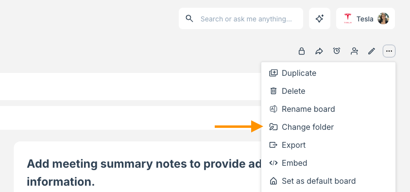 - Either create new boards in the folder, or add existing boards by going to the boards you want, by clicking on the three dots in the top-right of the page and selecting Change Folder.